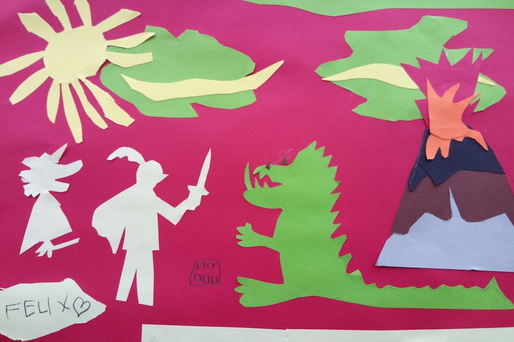 Farbige Tonpapiere standen zur Verfügung und es wurde fleißig gezeichnet, geschnitten und geklebt. Während manche Eltern die Verschnaufpause nutzten, während ihre Kleinen bastelten, gestalteten andere gemeinsam mit ihren Kindern farbige Scherenschnitte. So wurde die Künstlerwerkstatt zu einem gelungenen Familien-Kunst-Event am Tag der offenen Schule.