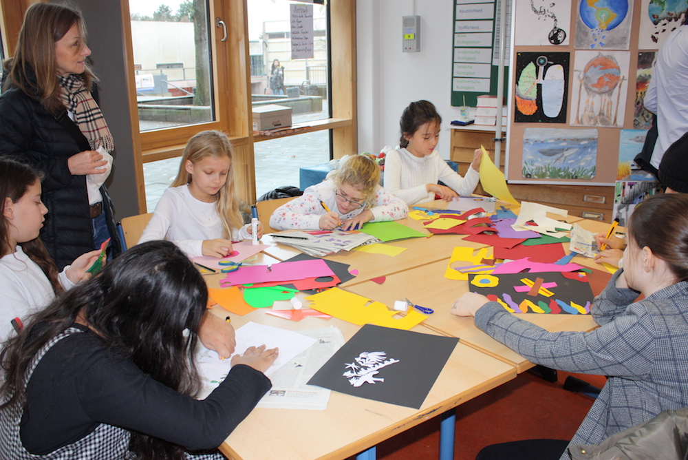 Farbige Tonpapiere standen zur Verfügung und es wurde fleißig gezeichnet, geschnitten und geklebt. Während manche Eltern die Verschnaufpause nutzten, während ihre Kleinen bastelten, gestalteten andere gemeinsam mit ihren Kindern farbige Scherenschnitte. So wurde die Künstlerwerkstatt zu einem gelungenen Familien-Kunst-Event am Tag der offenen Schule.