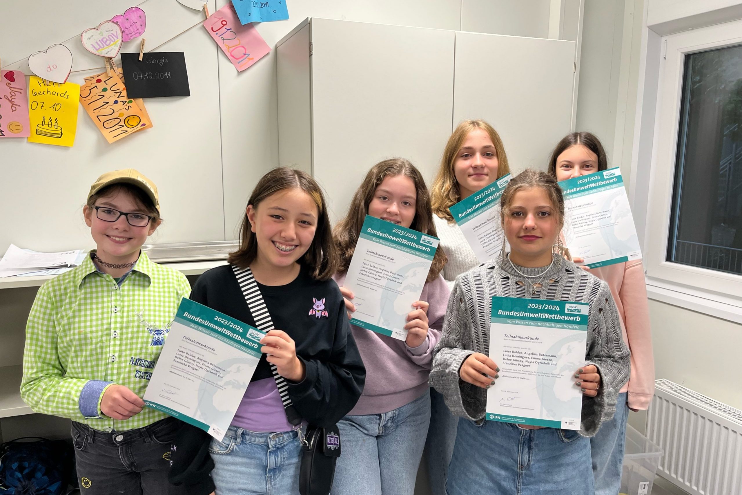 Letztes Schuljahr hat die MINT-Klasse (jetzige 7GC) im Rahmen des BundesUmweltWettbewerbs Projekte erarbeitet, die verschiedenste Umweltprobleme thematisieren. Nun wurden sechs Schülerinnen durch Urkunden Dank und besondere Anerkennung für ihre erfolgreiche Teilnahme ausgesprochen.