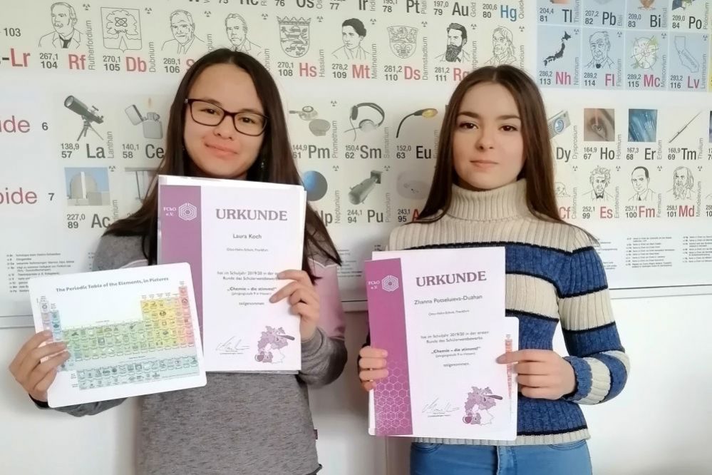 Laura Koch und Zhanna Potseluieva-Duzhan aus der Klasse 9Ga haben mit großem Engagement die vielfältigen anspruchsvollen Aufgaben des Wettbewerbs „Chemie, die stimmt“ bearbeitet. Dabei galt es, so manche Nuss zu knacken sowie auch geschickt und gründlich zu recherchieren.