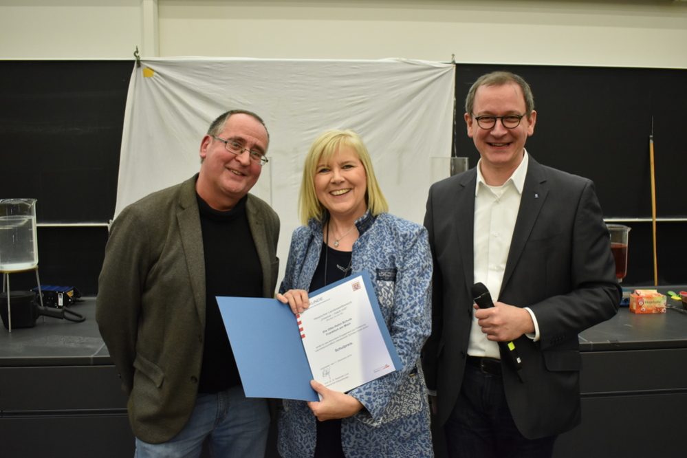 Umrahmt wurde die Veranstaltung durch einen Experimentalvortrag von Prof. Dr. Armin Lühken und Simon Zenglein mit dem Thema „Goethe und die Farben“. Die beiden Wissenschaftler führten durch einen Tag in Goethes Leben, der sich seinerzeit mit der Farbenlehre beschäftigt hat, und zeigten farbenfrohe und spektakuläre Experimente, die die Zuschauer*innen im Saal zum Staunen brachte. Der Vortrag schloss an den Wettbewerb für die Schüler*innen an, der mit „Zauberhafte Farben“ überschrieben war. Die Nachwuchs-Chemiker*innen untersuchten z. B. sogenannte Zauberstifte mit verschiedenen Test-Lösungen oder stellten eine Kupferionen-Lösung her, um Eisennägel zu verkupfern. Diese und andere Versuchsergebnisse stellten sie in teils sehr aufwändig gestalteten Mappen zusammen.
