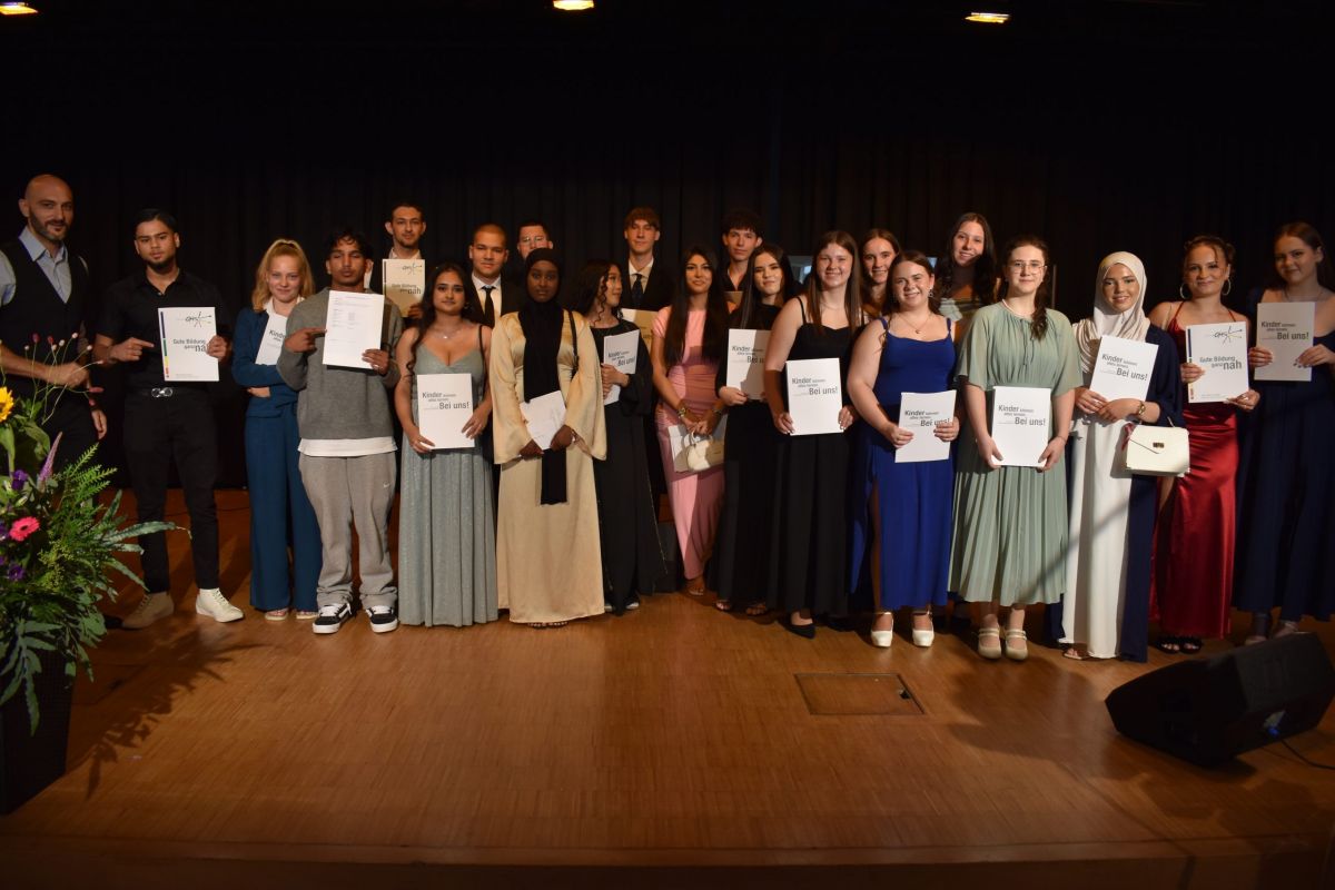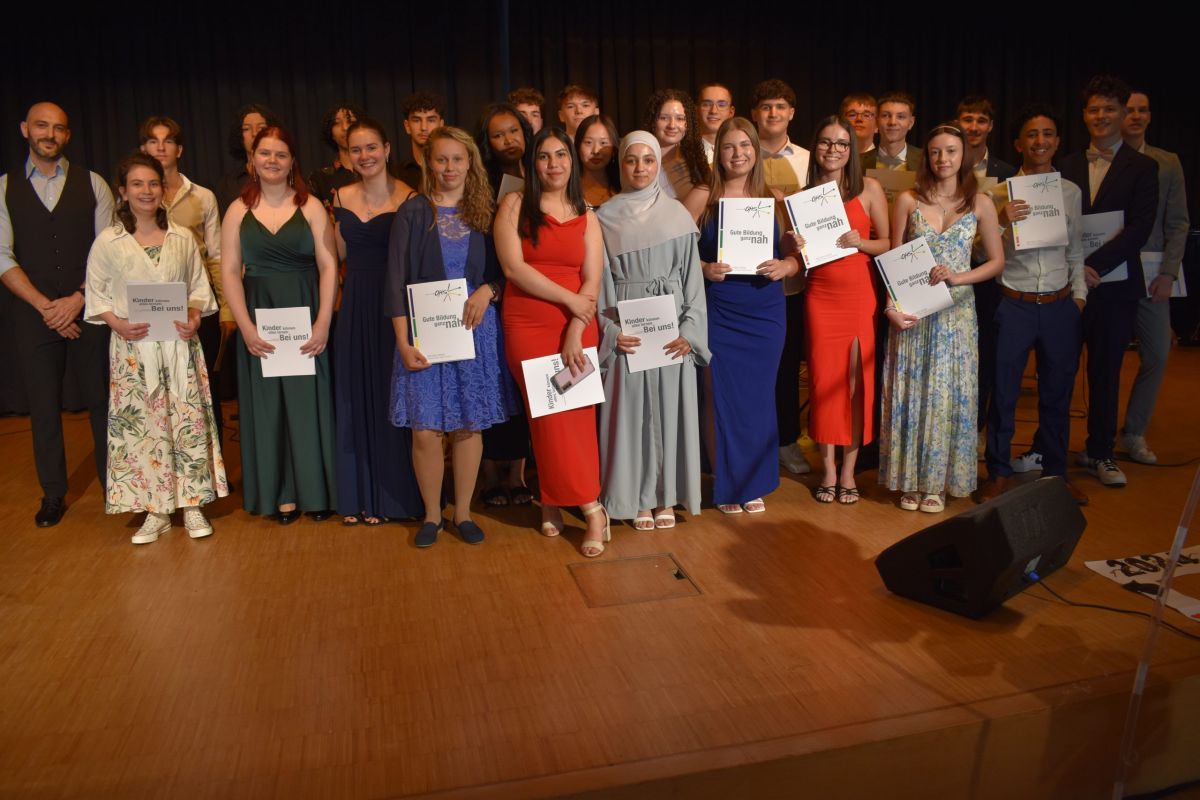 Kurz vor dem Ende des Schuljahres füllte sich die Große Aula mit Eltern, Familienmitgliedern und Freund:innen der Haupt- und Realschüler:innen, die bei der diesjährigen Feier ihre Abschlusszeugnisse erhielten. Von 49 Realschüler:innen erreichten ganze 30 Jugendliche die Eignung für die Gymnasiale Oberstufe. Einige von ihnen werden auch im kommenden Schuljahr, dann in der E-Phase, die Otto-Hahn-Schule besuchen. Von den 40 Hauptschüler:innen schafften über die Hälfte den qualifizierten Hauptschulabschluss, wodurch sie berechtigt sind, die zweijährige Berufsfachschule zu besuchen. Als Jahrgangsbeste wurden Smilja Gajic (10Ra), Sina Kratzer (10Rb), Marco Rosenberger (9Ha) und Cara-Sophia Kanthak (9Hb) ausgezeichnet. In ihren Ansprachen lobten die Stufenleiterin Ulrike Brauser, der Schulleiter Dirk Kapfenberger und die Vorsitzende des Schulelternbeirates Marion Kratzer das Durchhaltevermögen der Schüler:innen und gaben ihnen noch einige wertvolle Ratschläge mit auf den Weg. Ein besonderer Dank galt außerdem den Klassenlehrkräften Florian Gaukler (9Ha), Florian Nees (9Hb), Tomas Alvarez (10Ra) und Thomas Müller (10Rb), die die Jugendlichen über mehrere Jahre eng begleitet hatten.
