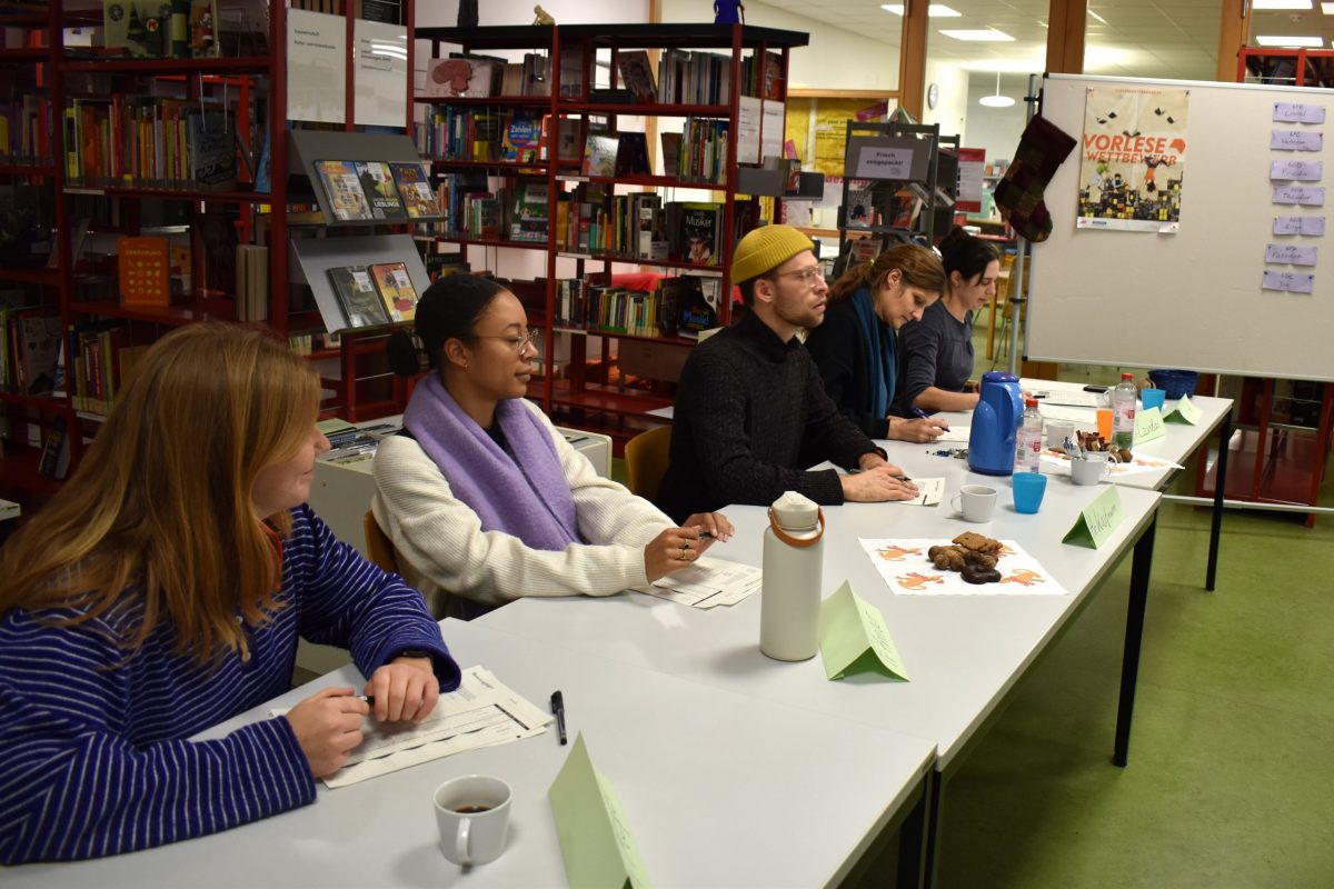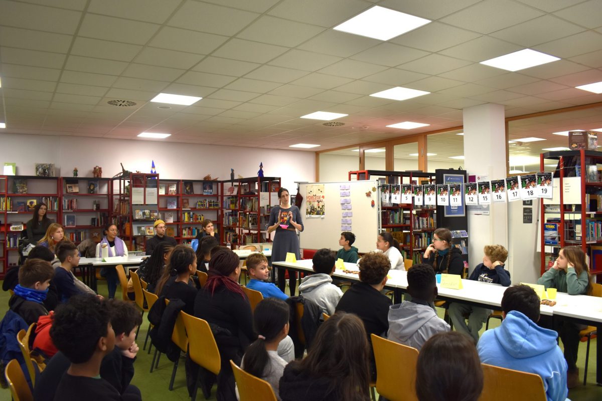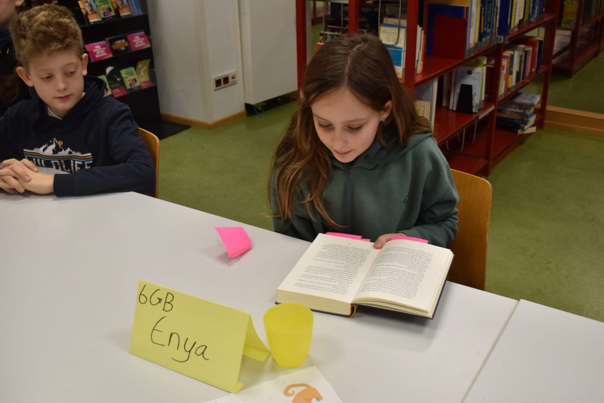 Die Jury bestand aus Lehrkräften der Schule: Frau Kirchhoff, Herr Kaufmann, Frau Czudai, Frau Meyer und die Schulbibliothekarin Frau Annour. Sie bewerteten die Sechstklässler:innen in verschiedenen Kategorien: zum Beispiel im flüssigen Lesen, im Tempo oder in der Betonung. Als Publikum kam u. a. die Klasse 5FB mit ihrer Deutschlehrerin Frau Zänger zu Besuch und hörten den Sechstklässler:innen beim Lesen gespannt zu.
