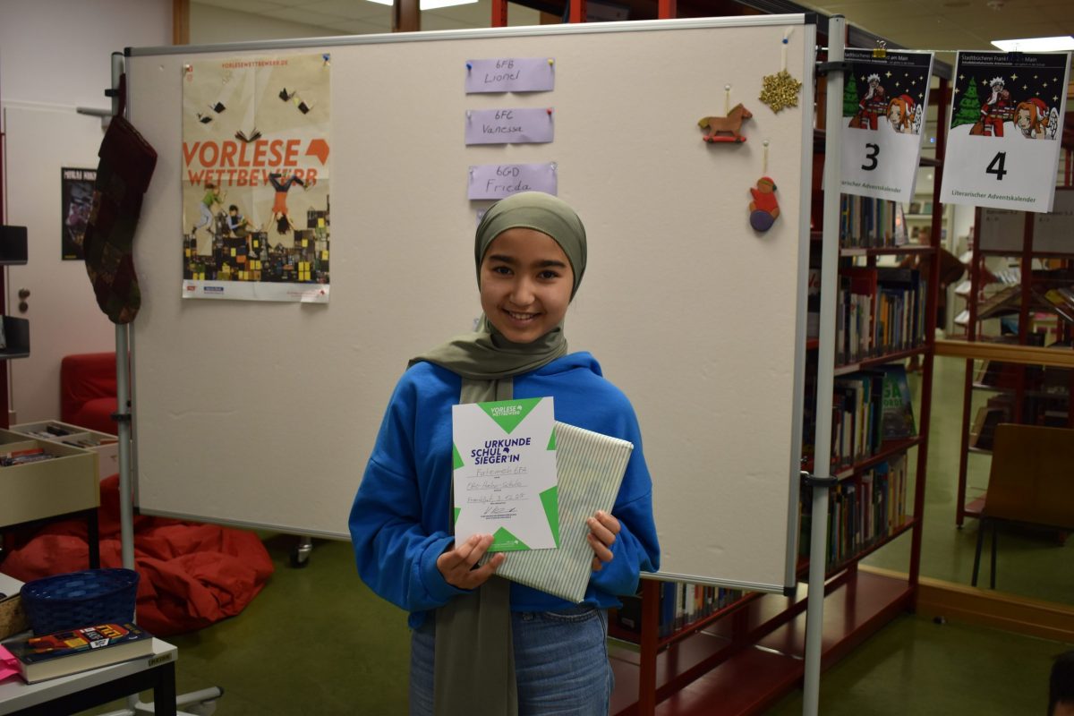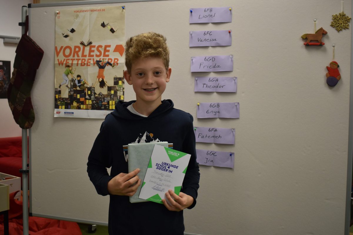 In diesem Jahr traten Lionel (6FB), Vanessa (6FC), Frida (6GD), Theodor (6GA), Enya (6GB), Fatemeh (6FA) und Jia (6GC) beim schulinternen Vorlesewettbewerb in der Schulbibliothek an. Sie wurden, durch einen Lesewettbewerb im Klassenverband, als beste:r Leser:in ausgewählt und landeten dann in der nächsten Runde, um gegen die Sieger:innen der Parallelklassen anzutreten.