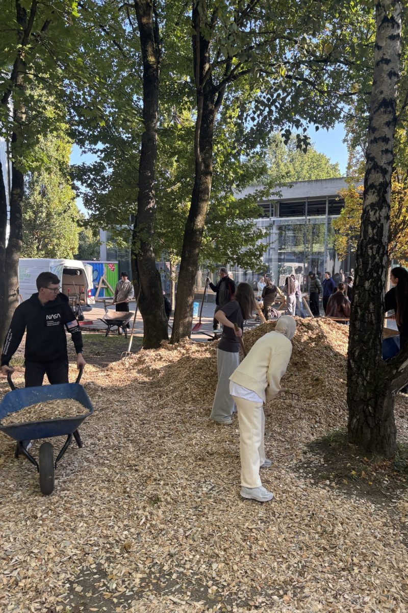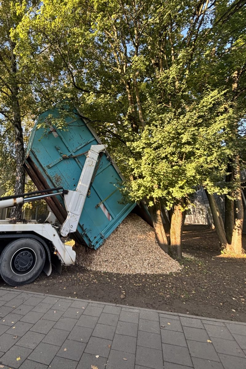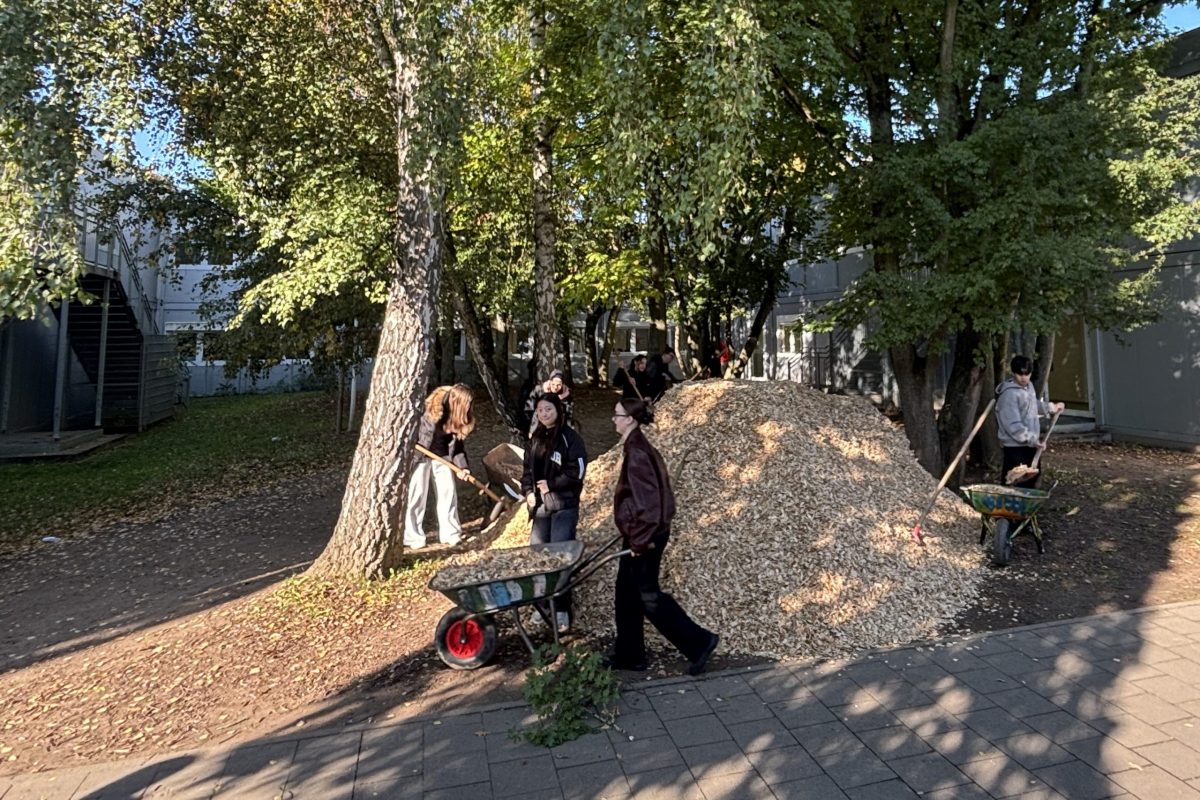 Erst kurz vor den Herbstferien wurde die Otto-Hahn-Schule erneut als Umweltschule ausgezeichnet. Um diese Zertifizierung zu erhalten, müssen Schulen sich in besonderer Weise im Bereich der Bildung zur nachhaltigen Entwicklung engagieren. Ein Baustein dafür war ein Projekt zur umweltfreundlichen Gestaltung des Schulhofes, das in Kooperation mit dem Umweltlernen Frankfurt vor den Herbstferien durchgeführt wurde. Dabei wurden Holzhäcksel im Innenhof des H-Containers verteilt. Die Holzhäcksel lassen den Bereich unter den Bäumen heller wirken und der – besonders im Herbst und Winter – matschige Boden ist bedeckt. Zudem wurden Chillböcke als Sitzmöglichkeiten errichtet, die besonders im Sommer zum Entspannen im Schatten der Bäume einladen. Die Finanzierung des Projekts übernahm das Schulamt; die Mitarbeitenden des Umweltlernens Frankfurt kümmerten sich im Vorfeld um alle möglichen organisatorischen Aspekte, wie z. B. die Anträge beim Grünflächenamt, die Bestellung der Materialien usw. Am Projekttag selbst halfen der WPU Green Team, der Biologie Leistungskurs der Q1 sowie zwischenzeitlich auch der Englisch-LK der Q1 von Frau Amling bei der Verteilung der Holzhäcksel und dem Aufbau der Chillböcke. Nebenbei thematisierten die Mitarbeitenden des Umweltlernens Themen wie die Holzverarbeitung oder die umweltfreundliche Holznutzung. Federführend war Frau Auth, verantwortliche Lehrkraft für die Umweltschule, für das Projekt verantwortlich: „Unsere Schülerinnen und Schüler waren wirklich fleißig und haben sehr selbstständig gearbeitet. Bisher kommen die Chillböcke super an und werden aktiv genutzt.“