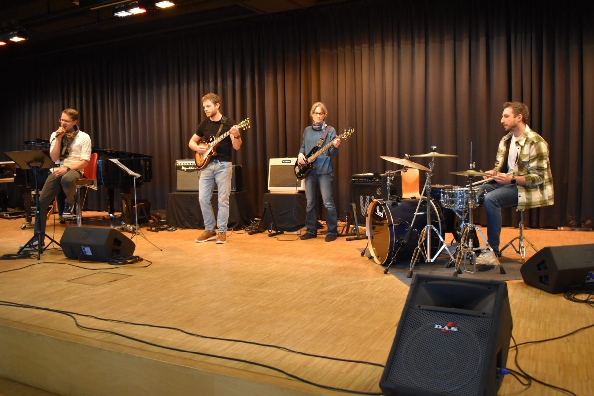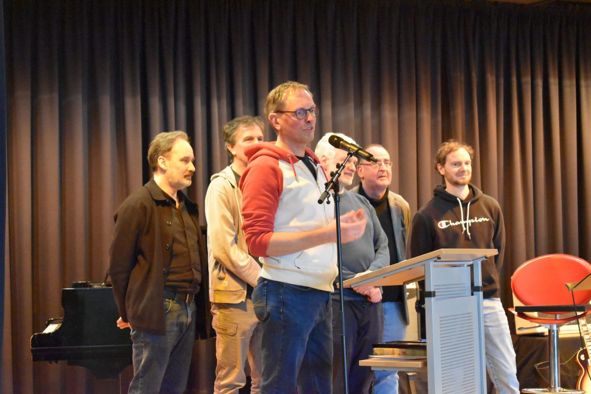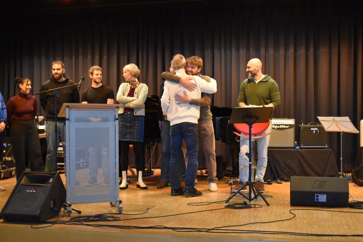 Bevor die Bühne der Ehrung Frank Ludwigs galt, performten Kolleg:innen und ein ehemaliger Schüler noch Udo Lindenbergs „Ich mach mein Ding“, dessen Text allen Ruheständlern gerecht wurde.