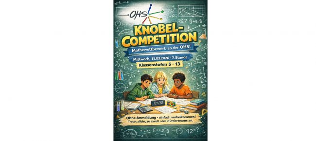Matheaufgabe des Monats wird durch neues Format ersetzt Autorin: Frau Woelk Die Matheaufgabe des Montas wird im zweiten Halbjahr durch ein neues Format abgelöst. Am Mittwoch, 11. März 2026 findet in der 7. Stunde die erste Knobel-Competition an der OHS statt. Schüler:innen aller Jahrgänge können allein, in zweier- oder dreier-Teams in verschiedenen Schwierigkeitsstufen gegeneinander antreten.…