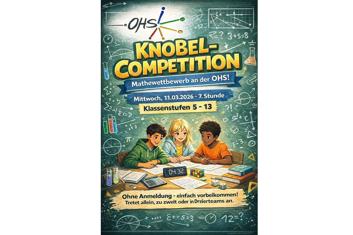 Die Matheaufgabe des Monats wird im zweiten Halbjahr durch ein neues Format abgelöst. Am Mittwoch, 11. März 2026 findet in der 7. Stunde die erste Knobel-Competition an der OHS statt (Raum C1.11) – Essen ist erlaubt! Schülerinnen und Schüler aller Jahrgänge können allein, in zweier- oder dreier-Teams in verschiedenen Schwierigkeitsstufen gegeneinander antreten. In der Vorrunde wird es auf Zeit Aufgaben aus dem Mathekänguru und der Mathe-Olympiade geben. Interessierte Schülerinnen und Schüler können einfach ohne Anmeldung vorbeikommen und mitmachen. Die Finalrunde findet am Montag, 11. Mai statt.