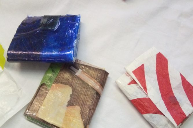 Im Anschluss ging es dann in die praktische Umsetzung. Das zu gestaltende Produkt sollte eine kleine Geldbörse werden. Die Kinder hatten über Wochen Plastiktüten gesammelt, die in einem ersten Schritt durch Übereinanderschichten und anschließendes Erhitzen mit dem Bügeleisen so umfunktioniert wurden, dass in einem zweiten Schritt aus den miteinander verschmolzenen Plastiktüten die einzelnen Teile für die Geldbörse zugeschnitten werden konnten. Frau Meister stellte hierfür ein spezielles Schnittmuster zur Verfügung. Das war schon eine knifflige Handarbeit, die viel Geschicklichkeit und Ausdauer verlangte. Durch exaktes Zuschneiden, sorgfältiges Anpassen und die bewusste Auswahl von Elementen, Formen und Farben sind dabei echte Hingucker entstanden.