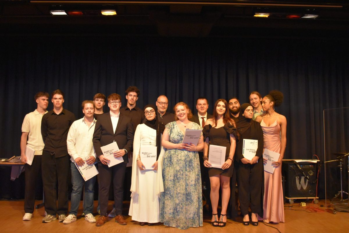 Als Nächstes baten die Lehrkräfte Anna Muthig und Daniel Scharfenberger vier Schüler:innen auf die Bühne, die sie auch „Die fantastischen 4“ nennen. Frau Muthig und Herr Schafenberger sangen ein eigenes Lied für Jule, Lasse, Nina und Nils, um ihnen für ihr außerordentliches Engagement für die Schulveranstaltungen zu danken.
